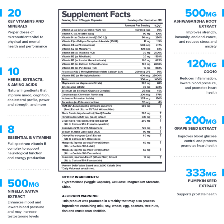 ✅ Comprehensive Formula – Packed with essential vitamins, minerals, and antioxidants designed to meet the nutritional needs of active men.